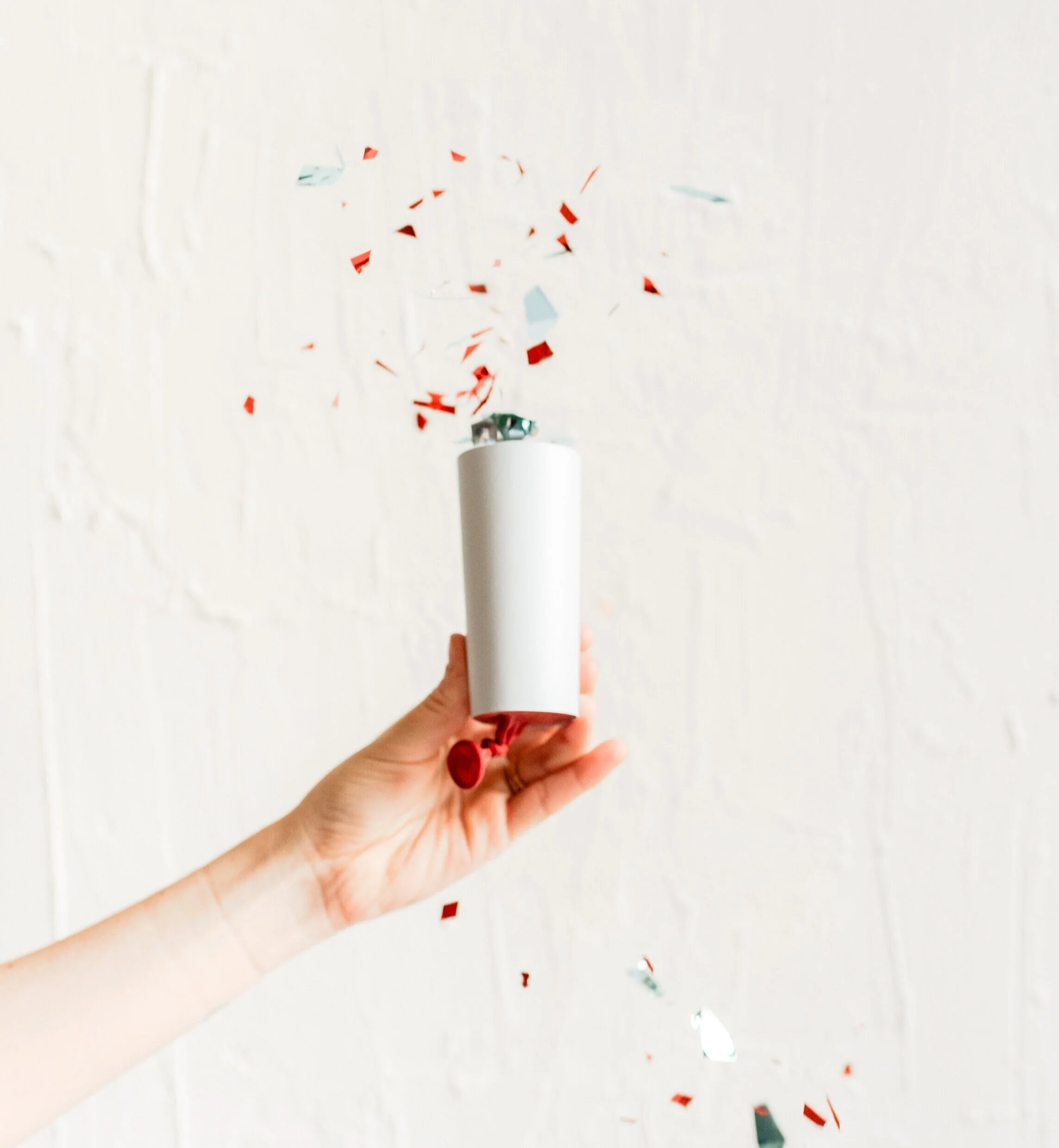 Hold your popper straight and fill with confetti. When you’re ready to release the confetti, simply pull the tied balloon down gently, let go and watch the confetti fly!